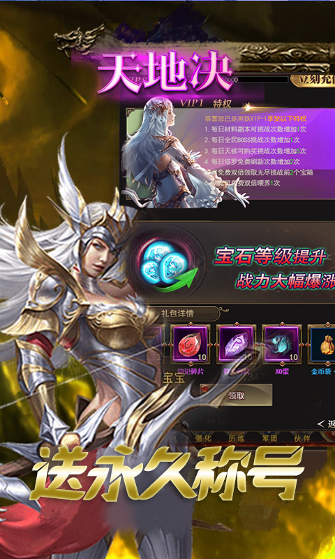 来玩就送VIP5,20W钻石,永久称号,永久翅膀,7大礼包助阵畅玩。