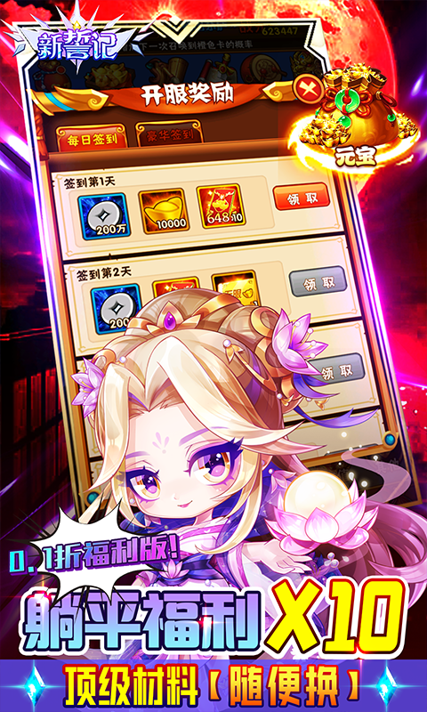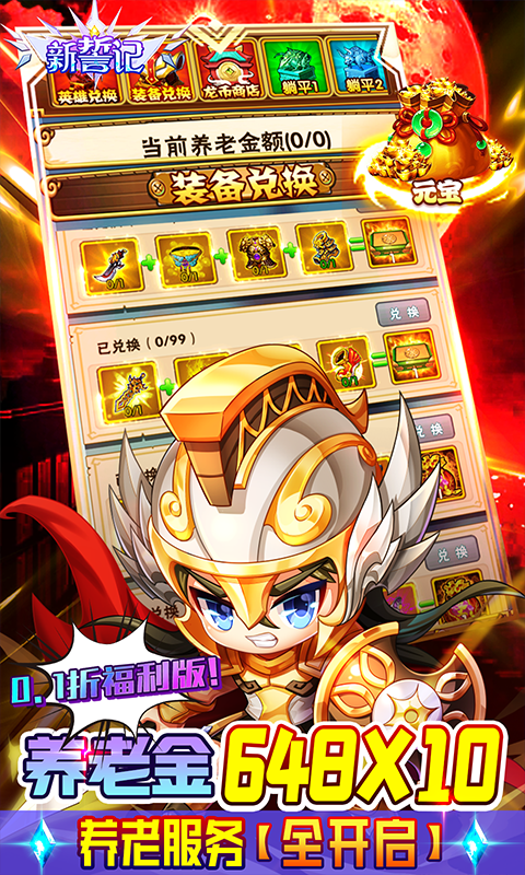 【新誓记(0.1折无限养老金)】是一款三国轻度卡牌游戏,新版本0.1折躺平养老来袭!上线送满级VIP,999元充值卡X2、海量物资;首日签到赠送648元X10养老金,可以激活躺平特权;首续0.1折,首充10元只需0.1元!【新誓记(0.1折无限养老金)】是一款三国轻度卡牌游戏,新版本0.1折躺平养老来袭!上线送满级VIP,999元充值卡X2、海量物资;首日签到赠送648元X10养老金,可以激活躺平特权;首续0.1折,首充10元只需0.1元!