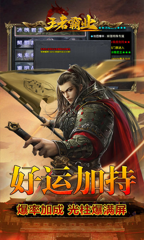 王者霸业(神将亿万爆爆爆),全新冰雪微变无限刀版本,范围群伤切割,送强力神将,充值卡,炫酷时装,自动回收,范围捡取!超高爆率!全屏嘲讽,范围切割,炫酷范围群攻,助你砍遍全图!全新地图,超多隐藏福利等你来领,活动boss无限刷!充值货币无限爆!准点攻沙,等你来战!全新冰雪微变无限刀版本来袭!还在等什么,快来加入吧!