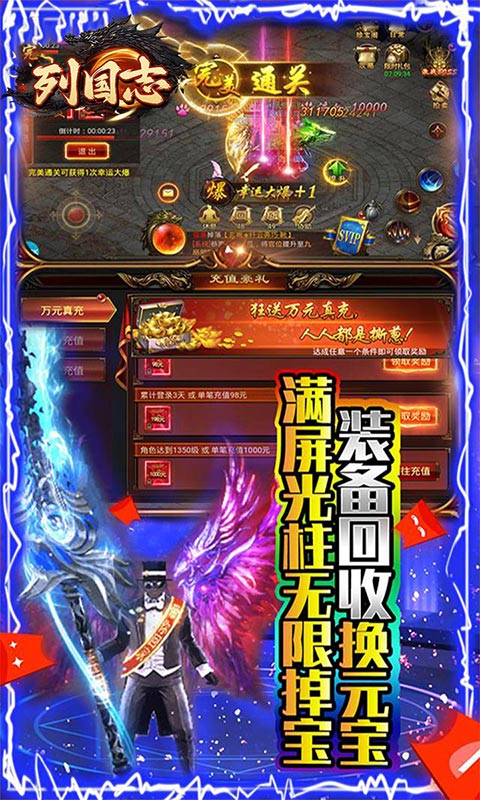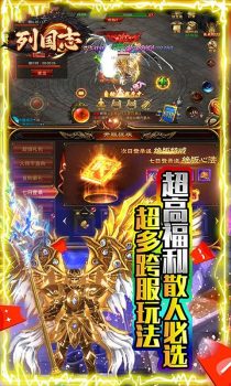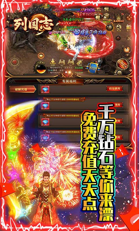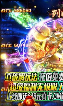 列国志(内置0.1破解版)是一款内置0.1折充值传奇手游,独家破解充值玩法,每天在线领免费充值,活动奖励一起拿;上线即送648元充值卡,使用直升贵族9。新手任务直领GM剑,GM甲,500万元宝,狂雷神剑。开局直接砍翻天。独家元神系统,超强元神伙伴,超多元神皮肤任你选。同时游戏新增超多玩法,个人战,团队赛,跨服比拼应有尽有!不定期多倍爆率活动,让你打宝手起刀落,满载而归,顶级全可爆,时间就是一切。