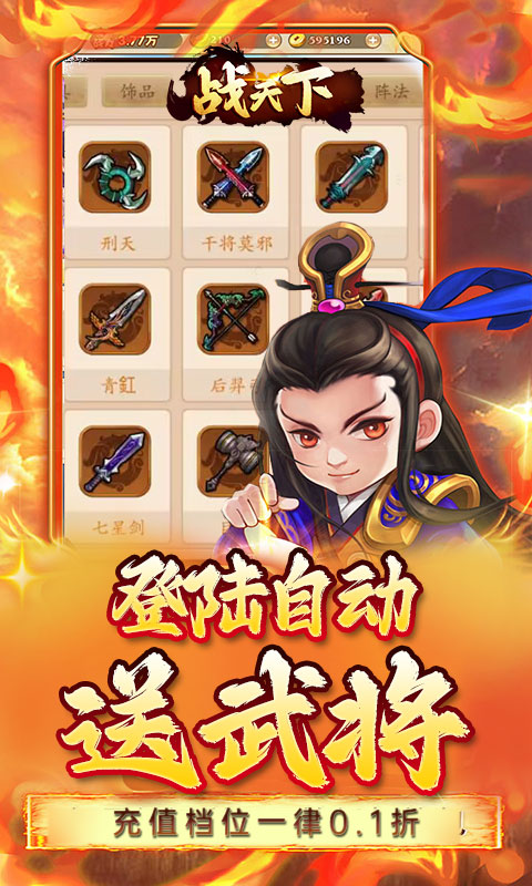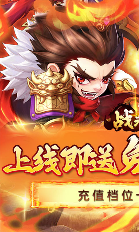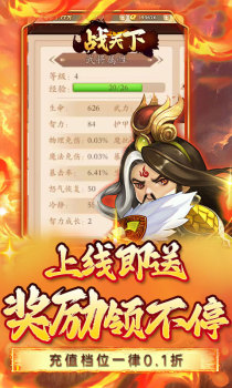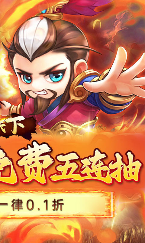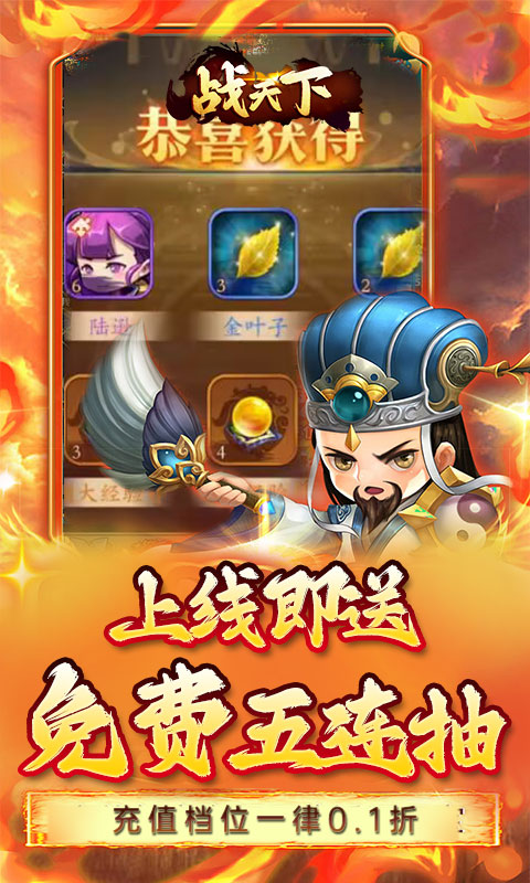 上线即送免费五连抽、在线奖励领不停、登录自动送武将,充值档位一律0.1折
