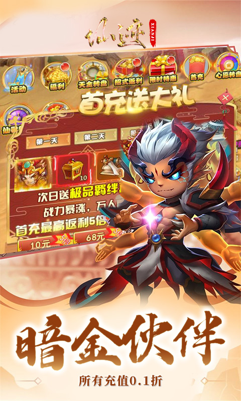 ★首充礼包送暗金神将*孙悟空,还能免费领取3天豪礼!极品羁绊套装,极品宝物等你来领!