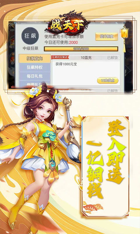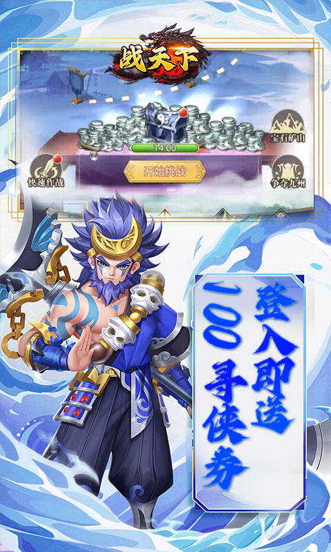 登入即送1亿经验,1亿铜钱,招募券*100,寻侠券*100,强哥抽奖券*1000,十星随机英雄