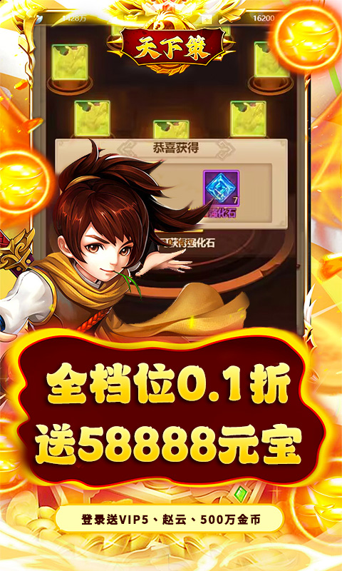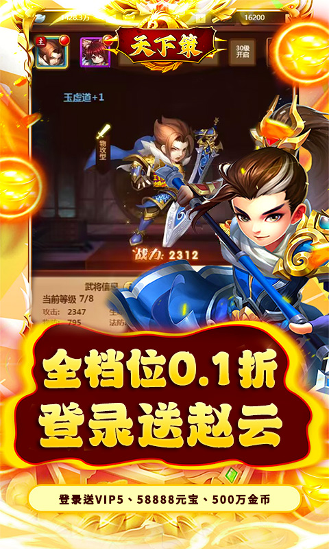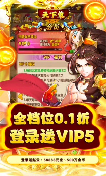 全部充值档位0.1折三国放置手游,首充只需1毛钱!指尖微操,武将战术多变,策略无限。多位武将任意技能组合释放。诸葛亮、曹操、赵云、吕布、貂蝉任意驱使,英雄枭雄,皆有你定。战阵千变万化,吴京的财报等你来拿,攻城拔寨,让你尽情享受征战四方、一统河山的快感。
