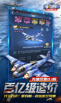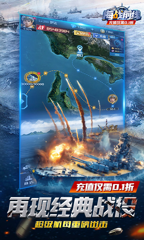《海战前线》是一款以未来海域军事战争为世界观的放置卡牌策略游戏。游戏深度还原超多种类航母、驱逐舰、潜艇、战列舰等经典战舰,其搭载超多种类舰载机、导弹、装备、舰炮等经典军武,为万千军迷玩家量身打造超多组队闯关、PVP、跨服等玩法,玩家将在这里组建水域最强舰队,共同推演一场场酣畅淋漓的经典海战。史诗再现,超燃战斗,只为等待真正的统帅!