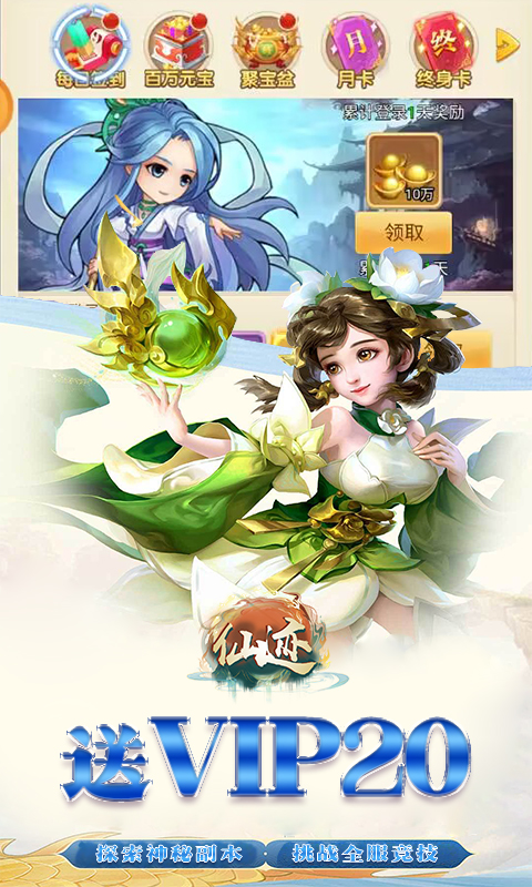 登录即送VIP20、元宝*20W、银两1000W、翅膀·霜雪之翼、宠物·粉红泡泡,登录7天送红色宠物·功夫熊猫!