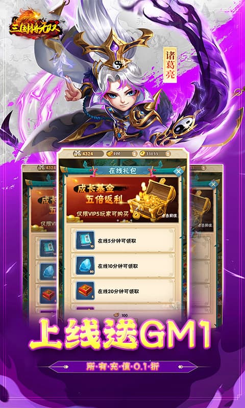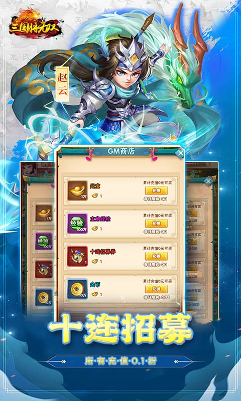 上线送满V、GM1、138888元宝、金币1000万、十连招募、所有充值0.1折