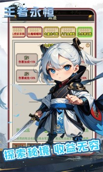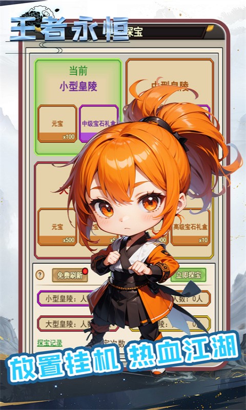 《王者永恒》是一款放置武侠手游,游戏里面玩家可以招募一个个身怀神功的武林侠客,组成自己的武侠小队,派遣他们去进行冒险和战斗。游戏中有着多种不同类型的武侠角色,而且不同的角色技能属性也是不同的,玩家可以从零开始不断修炼升级,海量副本任务等你来挑战,跟随剧情的发展不断战斗提高自身实力和等级,可以沉浸式感受古代武侠世界